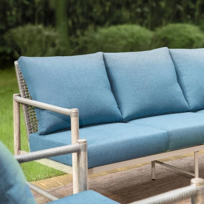 Add coastal charm to your outdoor space with this vintage-inspired sofa set, where weathered faux wood meets relaxed seaside elegance. The thick blue cushions cradle you in comfort, while rope-woven backrests and wrapped armrests bring natural texture to the design. Built for both style and relaxation, its ergonomic shape offers perfect support whether you’re enjoying morning coffee or sunset conversations. The durable construction stands up to the elements, making this beautifully crafted set as practical as it is picturesque for your patio or garden sanctuary.