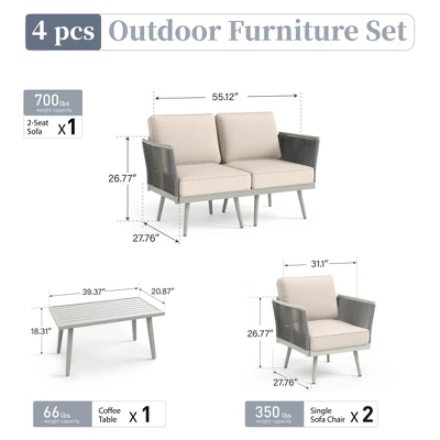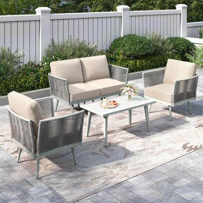 Elevate your outdoor living with the Captiva Designs Patio Conversation Set, where modern elegance meets effortless comfort. Crafted with a sleek gray metal frame and handwoven gray rope rattan, this set exudes timeless sophistication, perfectly complemented by plush beige cushions for a touch of warmth. The innovative detachable armrests let you customize your seating—whether hosting lively gatherings or lounging solo by the pool. Durable, weather-resistant materials ensure years of relaxation, while the sturdy coffee table with its textured top adds both function and style. Sink into the ultra-thick cushions, designed to stay lush and inviting season after season. Transform your garden, balcony, or patio into a serene retreat made for making memories.