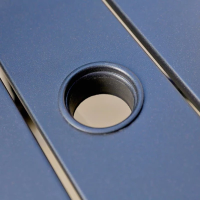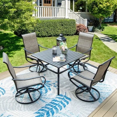 [CAPTIVA DESIGNS] Elevate your outdoor dining experience with Captiva Designs’ Outdoor Square Steel Dining Table in textured black. This modern, rust and water-resistant steel table accommodates four chairs comfortably, featuring a slat tabletop, a heavy-duty powder-coated metal frame, and an umbrella hole for shade on sunny days, making it a perfect choice for both outdoor and indoor settings, adding elegance and functionality to your space.Features